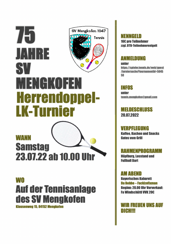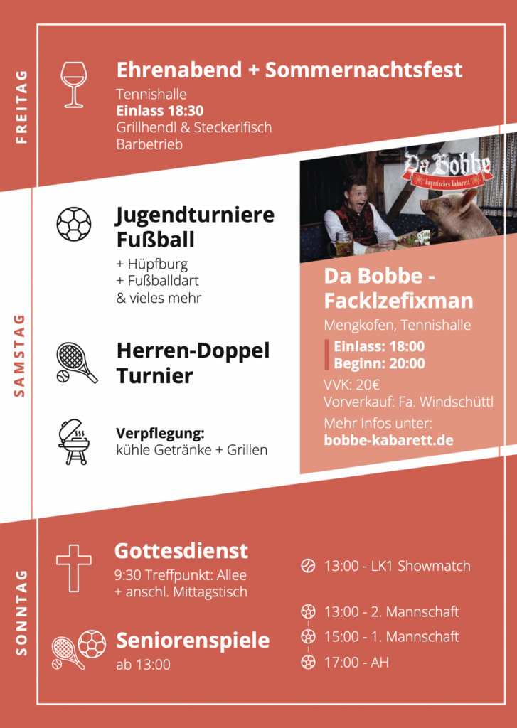 Das genaue Programm findet Ihr online unter www.sv-mengkofen.de, oder auf den aufgestellten Werbebannern, verteilten Flyern oder fragt einfach nach. Wir freuen uns!