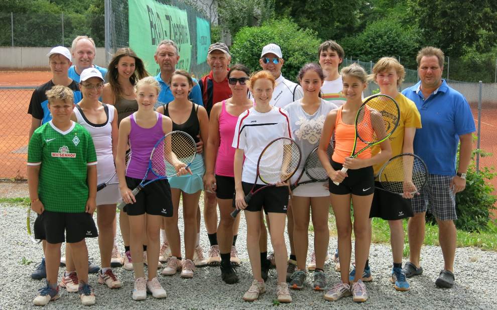 Saison-Höhepunkt, das Sommerfest „Rot und Weiß“. Die Teilnehmerzahl beim sportlichen Teil des Tages war mit 17 Spielerinnen und Spielern zwar etwas steigerungsfähig, angesichts einiger Alternativ-Events aber durchaus zufriedenstellend, zumal Altersstruktur und Leistungsstärke wieder bunt gemischt waren. Nach kurzer Einleitung von Abteilungsleiter Markus Feigl und Turnierorganisatorin Petra Ortmeier ging es dann auch gleich los mit Teil Eins des Events, dem „normalen“ Tennis. Dass es kaum „normales“ Tennis zu sehen gab, war nicht nur dem Spaß-Charakter dieses Turniers, sondern auch dem stark böigen Wind geschuldet, wobei alle Teilnehmer sichtlich Spaß an sehr vielen „unkonventionellen“ Ballwechseln hatten. Meist wusste der Spieler selbst nicht, wohin sein Schlag den Ball wohl führen würde, geschweige denn der Gegner, der auch hin und wieder in einer aufgewirbelten Staubwolke verschwand. Nach fünf Spielrunden wurde dann auch noch ein Sieger ermittelt, der aus den jeweils zwei Finalisten zweier Rundlauf-Ausscheidungen ausgespielt wurde. Hier setzten sich diesmal Alex Huber/Wolfgang Otte mit 10:6 gegen Franz-Josef Huber/Adrian Huber durch. Danach wechselte man nahtlos das Terrain von roten auf weißen Sand, und ging zum Beachtennis über. Im Drei gegen Drei wurde hier gespielt, und dabei in Halbfinale und Finale der Sieger ausgespielt. Auch hier wurde mit letztem Einsatz, und manchem Sandkorn zwischen den Zähnen gespielt, bis die Sieger feststanden. Im hochspannenden Finale setzten sich am Ende Cori Kremhelmer/Alex Huber/Kilian Huber mit 7:3, 4:7, 10:8 gegen Johanna Schiehandl/Lukas Polifka/Franz-Josef Huber durch. Als Sieger beider Finals wurde Alex Huber dann auch Gesamtsieger des Tages, der sich bei der Siegerehrung als Erster einen Preis aussuchen durfte. Die weiteren Platzierungen sind bei dieser Spaß-Veranstaltung völlig unerheblich und dienten nur der Preisverteilung. Zum anschließenden Grillabend fanden sich dann noch einige spätere Gäste ein, und so ließ man ein durchaus wieder gelungenes, achtes Sommerfest gemütlich ausklingen. Wann die letzten Teilnehmer, nach der Verlegung des Abends von der Terrasse ins Häusl, dieses dann verlassen haben, ist nicht bekannt.