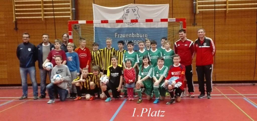 d1-130216Am Samstag reiste die D1 Jugend nach DGF in die Gymnasium-Turnhalle. Nach einem Traumstart mit 6:0 war klar wer hier Favorit ist. Mit einer überzeugenden und vor allem soliden Leistung sicherten sich die Fußballer den Turniersieg. Bis zum 6 Meterschießen im Finale hielt Thomas Klostermeier seinen Kasten sauber, ihm gelang sogar als Torwart ein Treffer. Auch im Finale überzeugte die Mannschaft, die Schützen verwandelten sicher und unser Torwart konnte gleich die ersten beiden Schüsse halten. Auf dem Bild: Der Turniersieger SVM D1 und der zweit platzierte Frauenbiburg D1 + alle Spielführer SVM Spieler in den den grünen Trikots, mit Co. Trainer Lisa Schlappinger