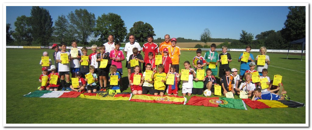Ein schöner Feriennachmittag mit fairen Spielen und heißen Fights ging langsam dem Ende zu. Gemeinsam, Kinder und Organisatoren mit ihren Helfern, eingesetzt als Schiedsrichter, waren sich einig, das war ein schöner Fußballnachmittag. Lothar Köglmeier und Mike Schlappinger nahmen die Siegerehrung vor. Die Siegertruppe Belgien bekamen die Goldmedaille um den Hals gehängt. Silber ging an Spanien und Bronze an Deutschland. Die Spieler von Portugal und Italien bekamen ebenfalls als Auszeichnung eine Medaille überreicht. Mit der Siegerehrung der jeweiligen Jahrgangsgruppen vom Wettbewerb „der härteste Schuss“ und mit der Urkundenüberreichung an alle Spieler endete die super Ferienprogrammveranstaltung.