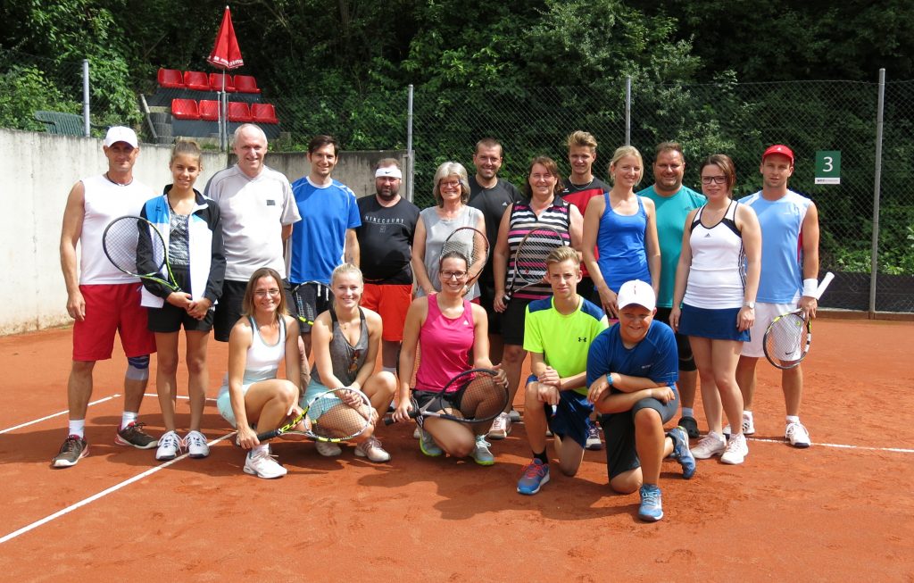 Jaja, schon wieder ein kleines Jubiläum. Bereits zum zehnten Mal veranstalteten die Tennisler ihr Sommerfest mit Gaudi-Turnier, und Petrus nahm wie immer gerne teil. Zehn Sommerfeste – 10 Mal Traumwetter – das muss man erst mal hinbekommen, oder sind die Tennisler wirklich so brav (Manch Teilnehmerin behauptete das von sich). Auf jeden Fall hatte man nach nur 10°C noch am Mittwoch, am Samstag 29.Juli wieder hochsommerliche Temperaturen, und musste, trotz „lockeren Gaudi-Spielen“, wieder mal ganz schön Schwitzen. Mit knapp 20 Teilnehmern war man zwar halbwegs zufrieden, hat aber auch noch deutlich Luft nach oben. Nach der Begrüßung durch Abteilungsleiter Markus ging Petra zur Auslosung über, die vor jeder Spielrunde anstand. Und schon begannen die meist hoch amüsanten Spiele auf allen 4 Plätzen, und jeder hatte den Spaßfaktor verinnerlicht. Da die Ergebnisse ohnehin nebensächlich waren, gab es natürlich auch den ein oder anderen kuriosen Ballwechsel, der auch den iranischen „Tennisclown“ Mansour Bahrami“ begeistert hätte. Nach einigen Spielrunden hatte man dann genug geschwitzt und scharte sich um den „gefühlt kühleren“ Grill..!!?? Aber natürlich nur kurz, um Tom eins der leckeren Würstel oder Steaks zu entreißen. Danach feierte man noch in die Nacht hinein, während die Kids, bei jetzt angenehmeren Graden, noch bis zur völligen Dunkelheit die Schläger schwangen. Bleibt zu hoffen, dass man künftig bei diesem echt spaßigen Event einige Mitglieder mehr begrüßen darf.