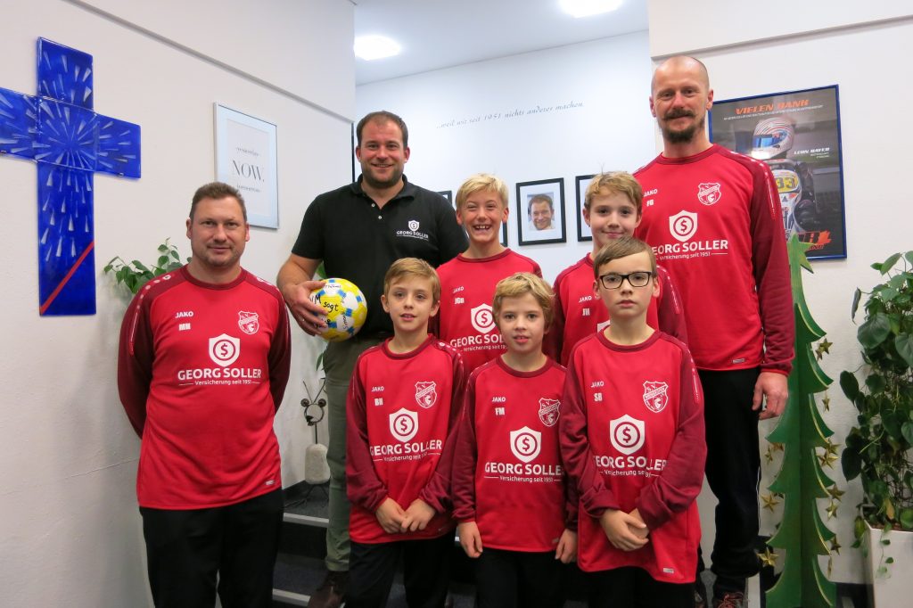 Kurz vor Weihnachten konnte sich die E1-Jugend des SV Mengkofen über ein großzügiges Geschenk freuen.Das Versicherungsmaklerbüro Georg Soller aus Straubing übergab der Abordnung der Jugendfußballer einen Satz neue Trainingsshirts. Die in den Vereinsfarben gehaltenen Oberteile sind mit dem Wappen des Sportvereins und den Initialen der Spieler versehen und verstärken somit das Mannschaftsgefühl. Die Betreuer Markus Heuberger und Franz Guggenberger bedankten sich herzlich bei der Übergabe bei Georg Soller, der von den Fußballern als kleine Erkenntlichkeit einen Spielball mit den Unterschriften der Jugendmannschaft überreicht bekam.