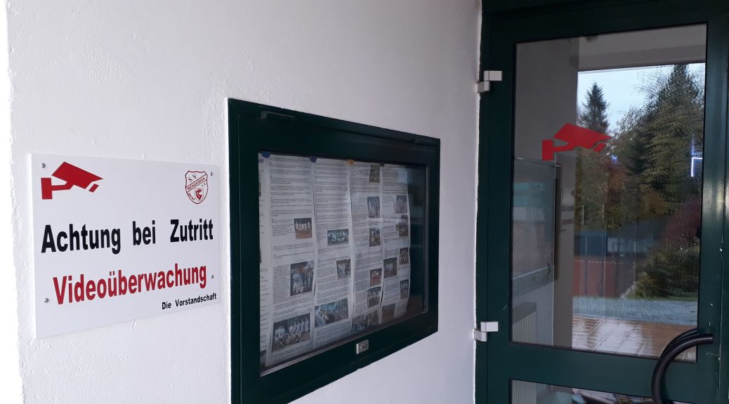 Ort der Videoüberwachung: Ab dem 04.01.2019 ist der untere Eingang zum Sportheim, genauer der Gang zu den Umkleidekabinen Fußball und der Durchgang zur Tennishalle videoüberwacht. An der Eingangstür und dem Beginn der Videoüberwachung (siehe Bild) ist ein großer Warnhinweis in Wort und Bild, der auf den Überwachungsbereich hinweist.