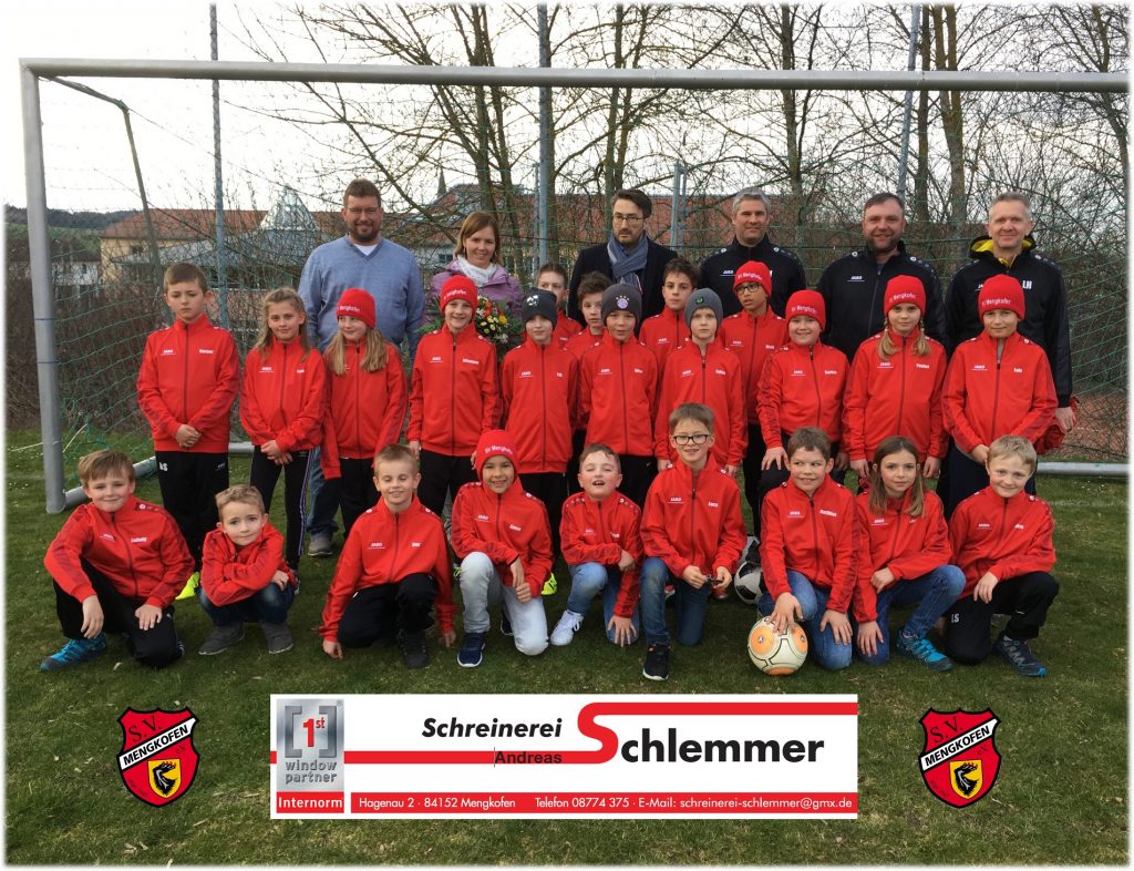 Pünktlich zum Start in die Rückrunde sponserte die Schreinerei Schlemmer aus Hagenau einen Satz Trainingsanzüge samt T-Shirts für die E2- und F1-Jugend des SV Mengkofen. Die Jungs und Mädls freuten sich sehr über die großzügige Spende, vor allem, weil die alten Anzüge schon sehr klein und durch die Hallensaison schon sehr in Mitleidenschaft gezogen wurden. Jacken, Hosen und T-Shirt sind mit Namen versehen und somit verwechslungssicher.