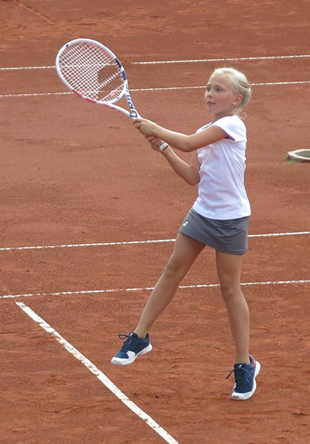 Die Mädchen auf dem Großfeld spielten den Sieger in einer 6er-Runde Jede gegen Jede aus. Dabei fiel, neben einer bemerkenswert hohen Leistungsdichte des Feldes, besonders die Leistungssteigerung zum Vorjahr auf. Und so bekamen Eltern und Zuschauer reihenweise beeindruckende Ballwechsel zu bestaunen, die diese oft staunend mit „Ahhh“ und „Ohhh“ quittierten. Gespielt wurden Sätze bis vier Spiele – und selbst das war für die Mädels, bei fünf zu bestreitenden Matches, und für die Jahreszeit noch schweißtreibenden Temperaturen – eine Herausforderung. Größter Beleg für die große Ausgeglichenheit des Feldes ist die Punktgleichheit auf den Plätzen Zwei bis Vier. Dabei hatte Anna Ortmeier Miriam Held überraschend mit dem klarsten Ergebnis des Bewerbes 4:0, 4:1 geschlagen, verlor dann allerdings gegen ihre Schwester Pia sehr knapp 4:1, 2:4, 6:8, die wiederum gegen Miram Held 1:4, 3:4 unterlegen war. Damit beendeten die Drei das Turnier mit 3:2 Siegen, und das Satzverhältnis musste über die Platzierungen entscheiden. Dieses verteilte Miriam Held auf Platz 2 mit 7:4 Sätzen, auf Platz 3 Anna Ortmeier (7:6) und mit 6:5 Sätzen Pia Ortmeier auf Platz 4.
