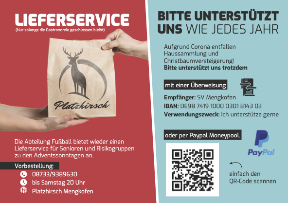 Aufgrund von Corona entfallen Haussammlung und Christbaumversteigerung. Bitte unterstützt uns trotzdem mit einer Überweisung oder per Paypal Moneypool.