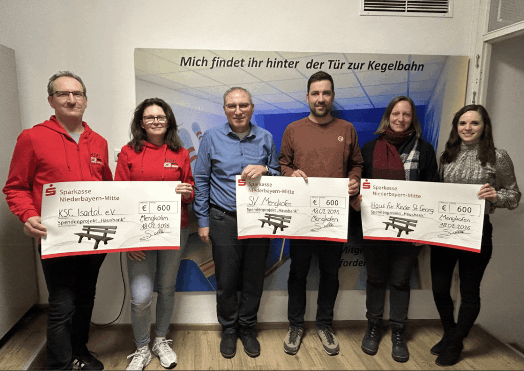 Im Rahmen des Spendenprojekts „Hausbank“ der Sparkasse Niederbayern‑Mitte wurden mehrere Vereine aus der Region unterstützt. Auch der SV Mengkofen gehörte zu den Gewinnervereinen, die zur symbolischen Spendenübergabe in den Räumen des SV Mengkofen zusammenkamen.