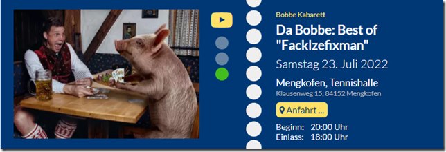 Lustig geht es dann abends weiter mit Bobbe ́s Kabarett. Wir versprechen, Du wirst Tränen lachen bei dem Programm „Da Bobbe – Facklzefixman“. Sichere Dir gleich die Eintrittskarte online unter www.bobbe-kabarett.de oder über den Kartenvorverkauf bei der Fa. Windschüttl.